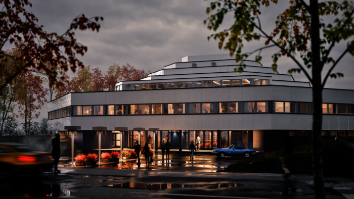 Hoone keskel asub katuseaknaga spordisaal, mida ümbritseb koridor. Välisfassaadi keskosa ilmestab lintakende rivi, mille taga asuvad teise korruse bürooruumid.